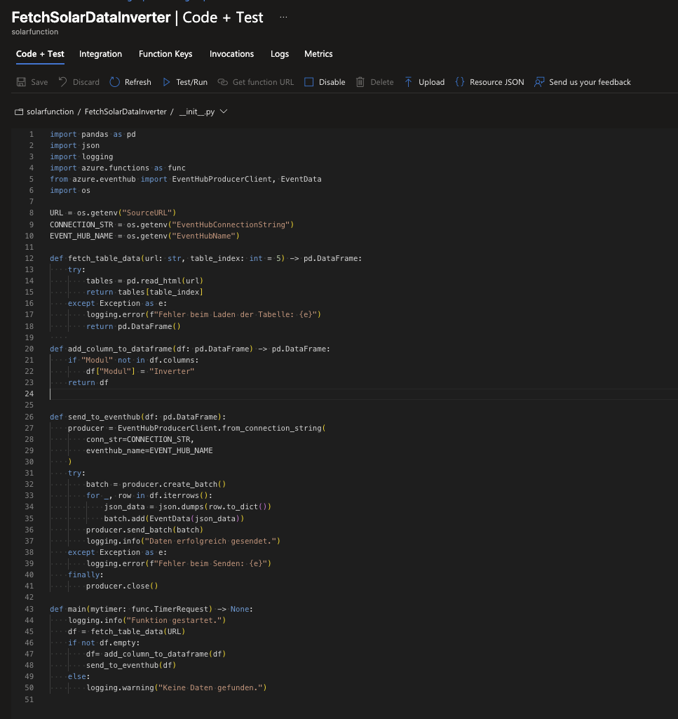 Im nächsten Schritt habe ich die Azure Function erstellt. In diesem Abschnitt zeige ich einen Auszug der fertigen Function in Form von Screenshots, ergänzt durch weitere Bilder – unter anderem auch einen Screenshot der Webseite, von der die Daten geladen werden.