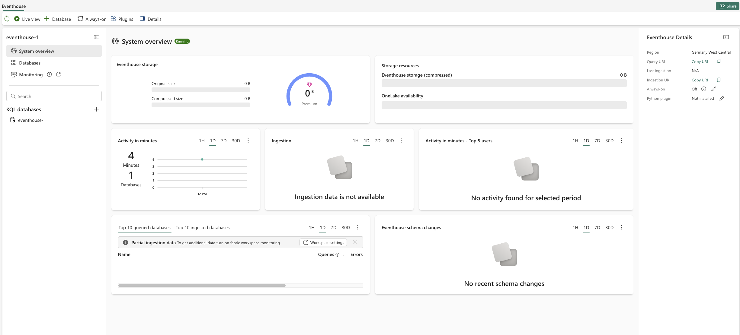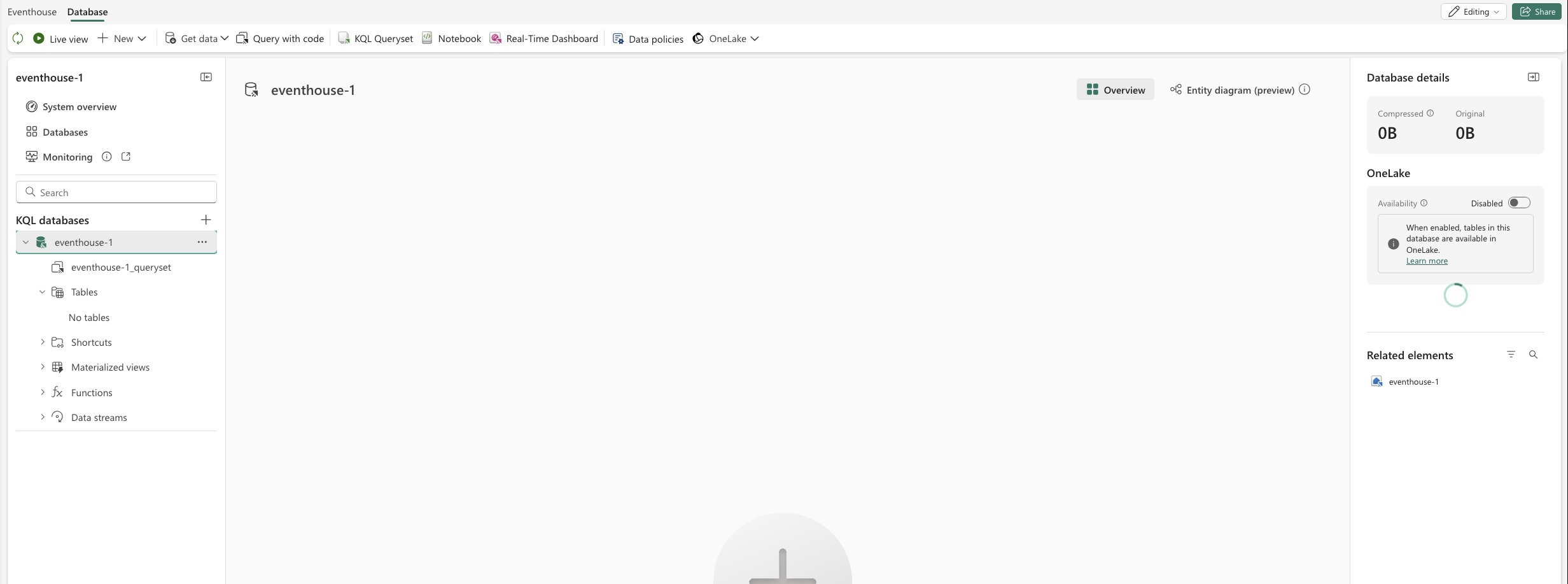 Nach der Erstellung wirst du automatisch auf die Eventhouse-Seite weitergeleitet. Von dort aus kannst du zur Datenbank wechseln und weitere Einstellungen vornehmen.