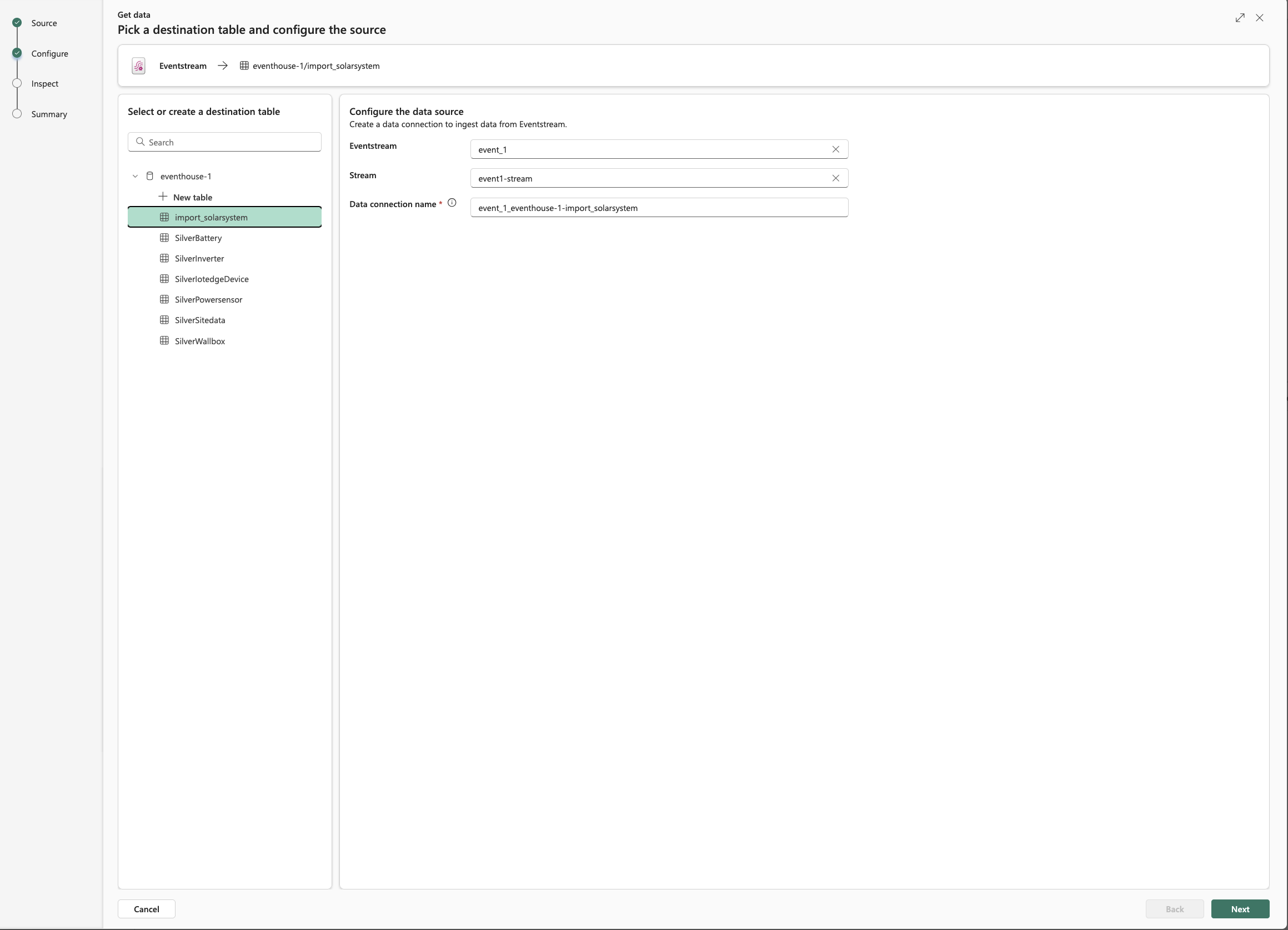 Funktioniert dieser Schritt wie erwartet, können wir im nächsten Schritt das Eventhouse erstellen und die benötigten Tabellen anlegen, um die eingehenden Daten dauerhaft zu speichern.
