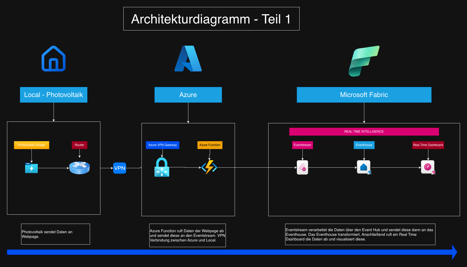 So entstand die Idee, meine Photovoltaikanlage mit Microsoft Fabric und Real Time Intelligence zu verbinden und die erzeugten Daten in Echtzeit zu verarbeiten und auszuwerten – ein persönliches Projekt, das mir gleichzeitig ermöglicht, die Technik praxisnah zu erforschen.