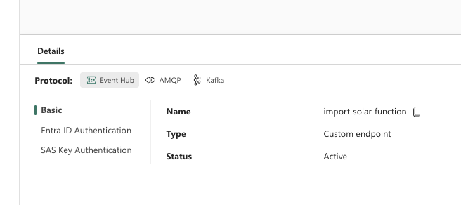 Sobald der Eventstream veröffentlicht wurde, können der Event Hub Name und der Endpoint Name in der Azure Function hinterlegt werden.