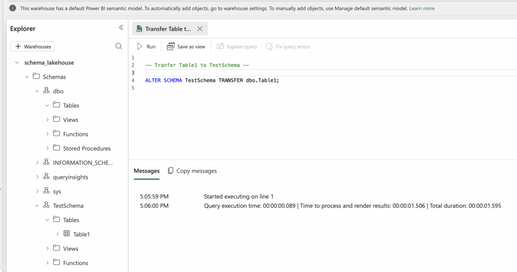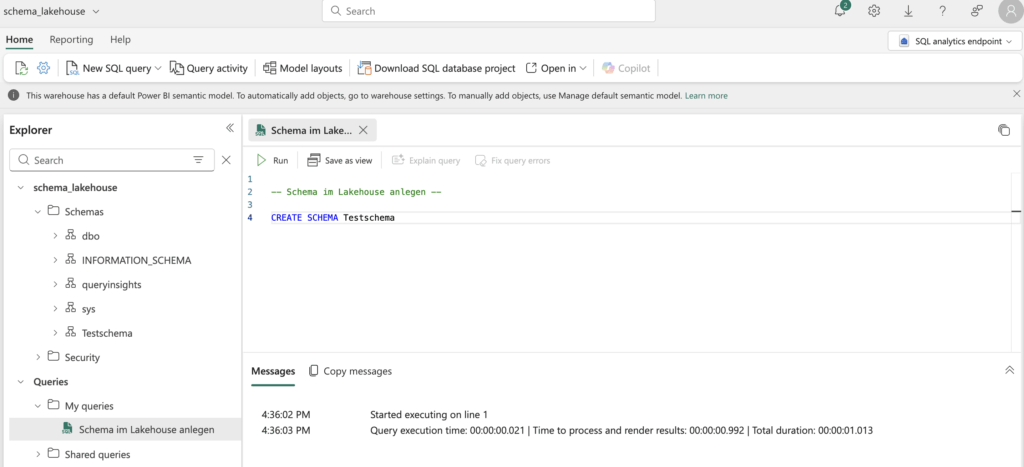 Im letzen Schritt gehen wir wieder zum SQL Endpoint und verschieben die erstellte Tabelle in das neue Schema.