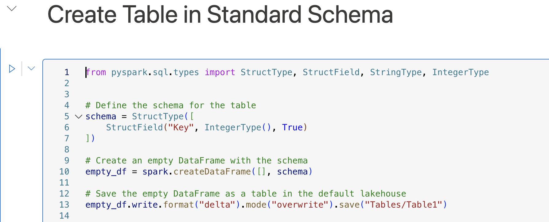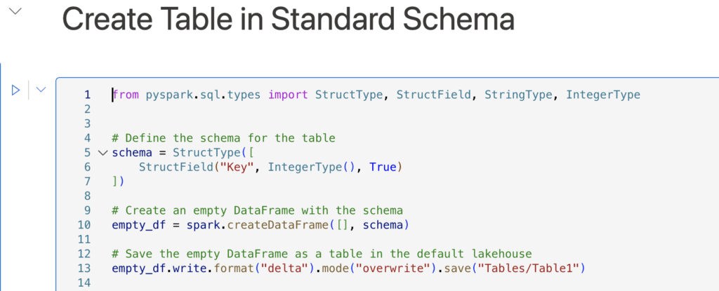 Hier zu müssen wir in meinem Beispiel ein paar Umwege gehen. Denn es ist nicht möglich direkt per Notebook ein Schema im Lakehouse anzulegen sofern man das Standard Lakehouse bereitstellt (Stand Heute 29.07.25)